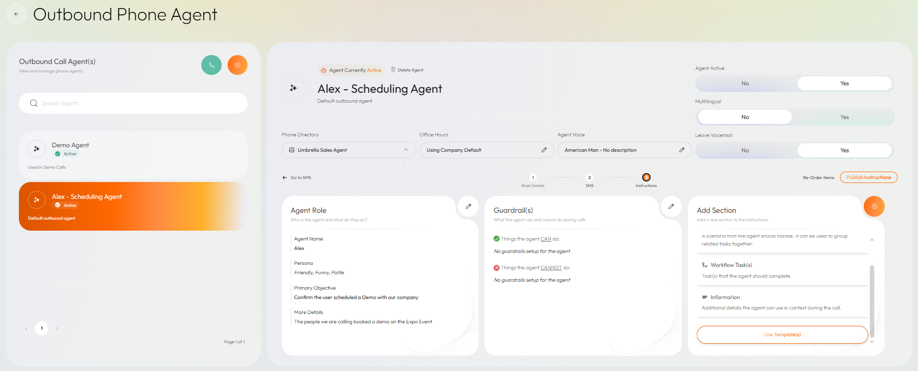 Create inbound and outbound agents using ARKK's Agent Builder, or use an existing template to get started with your first agent. See more on how to create a Phone Agent.