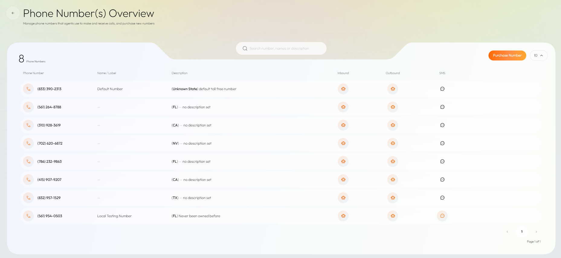 Get phone numbers for your phone agent(s) to make and receive calls. Your company starts with a toll free number, but it is encouraged that your agent uses multiple phone numbers for features like local presence. Go to ‘Phone Numbers’ from the ARKK App navigation menu, or click here. See more information on Purchasing Phone Numbers.