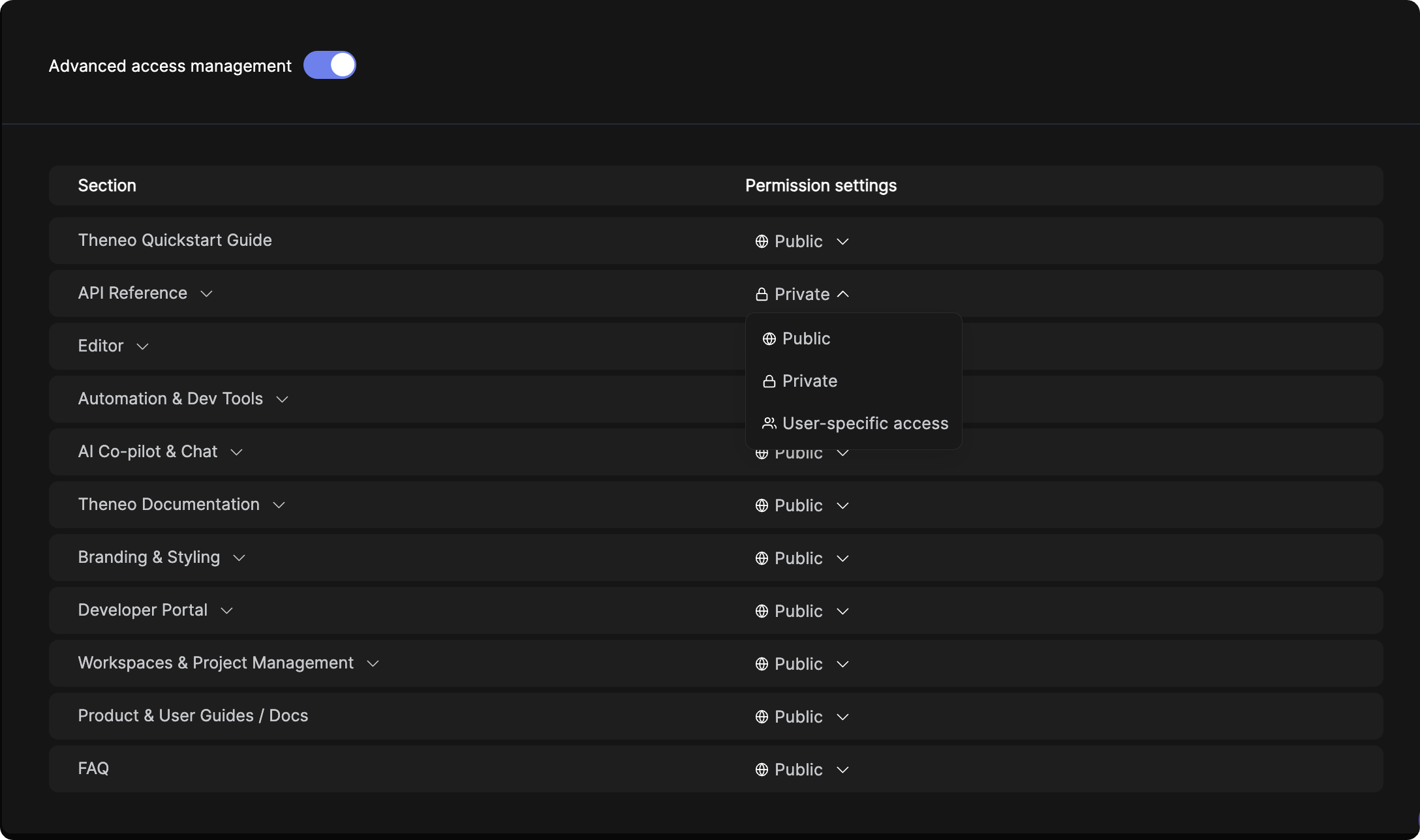 Theneo provides robust access management capabilities, allowing for both project-wide and section-specific access controls. This ensures that only authorized users can view or edit specific sections or subsections within a project. Here's a detailed guide on how to manage access at these granular levels.
