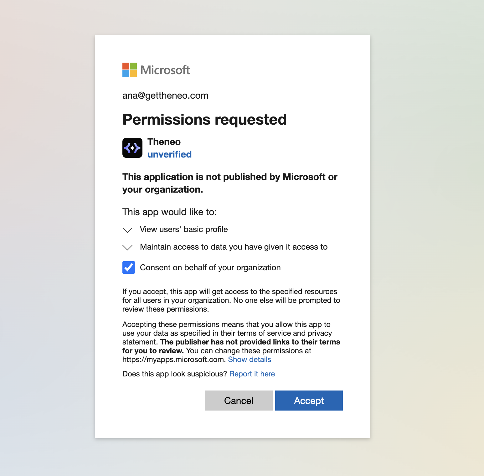 - Click "Accept" to authorize the integration. Microsoft will confirm this authorization and redirect you back to Theneo.