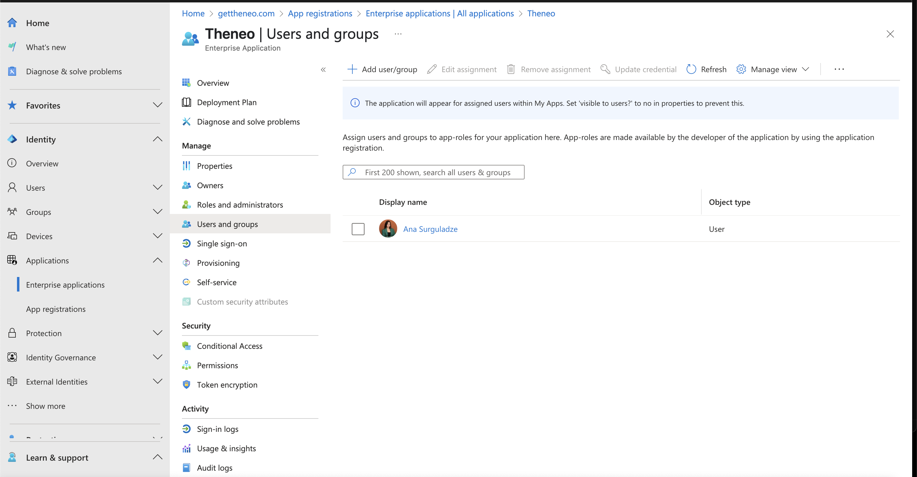 - Click "Add user/group", then select specific users or groups from your Azure AD that need access to Theneo. This allows precise control over who within your organization can use the application.